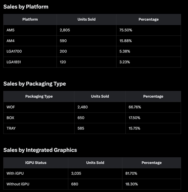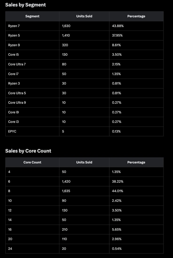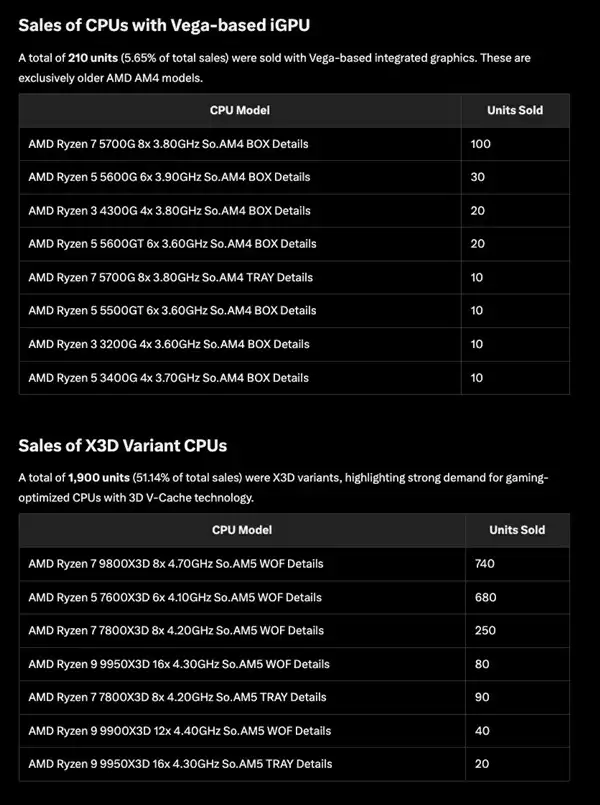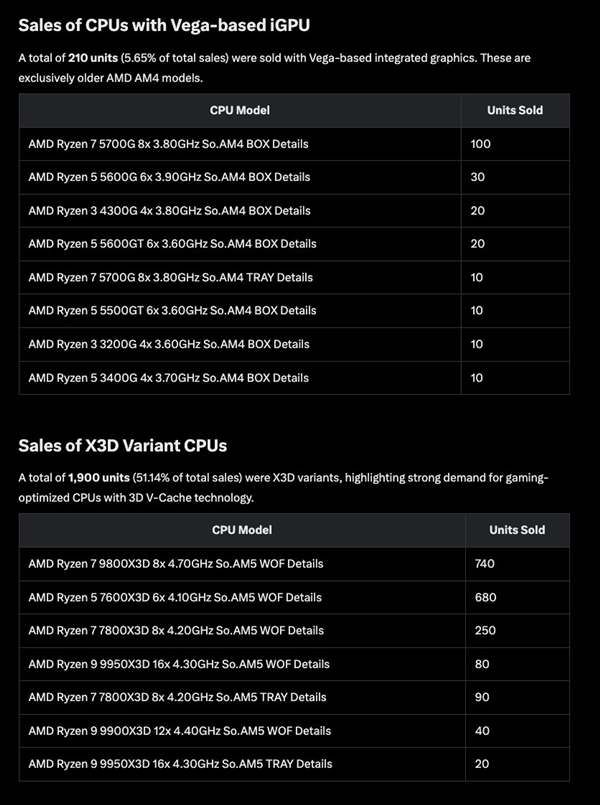 具体型号上,8核心设计的锐龙7 9800X3D和7800X3D最受游戏玩家喜爱,销量分别达到740颗和250颗;6核心的锐龙5 7600X3D同样热销,本周售出680颗。