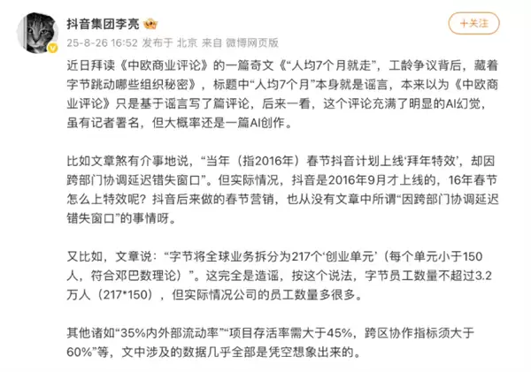 8月27日消息,据媒体报道,抖音集团副总裁李亮近日公开发文,再次驳斥了“字节跳动员工平均在职仅7个月”的传闻,并指出相关评论文章存在多处失实,疑似为AI生成内容。