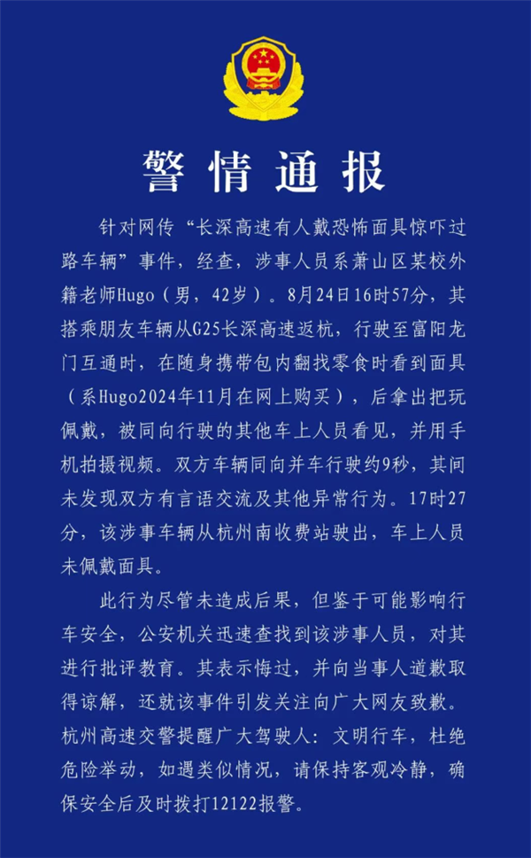 今天凌晨,杭州高速交警发布通报,回应网传“长深高速有人戴恐怖面具惊吓过路车辆”一事。