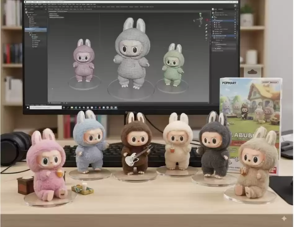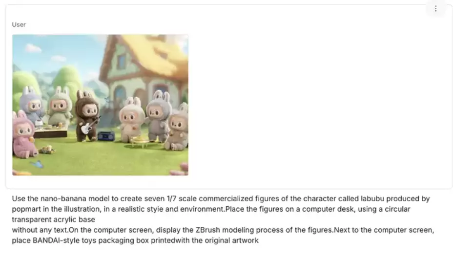 直接上传一张Labubu的商品图,并复制修改了这段广为流传的手办Prompt,生成结果如下:
