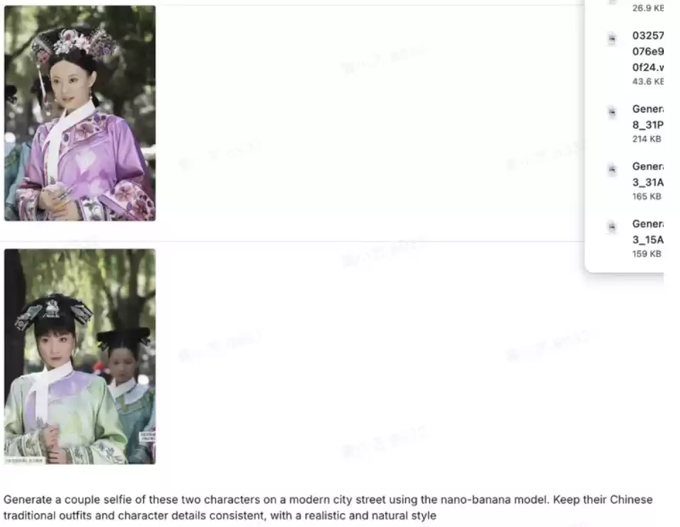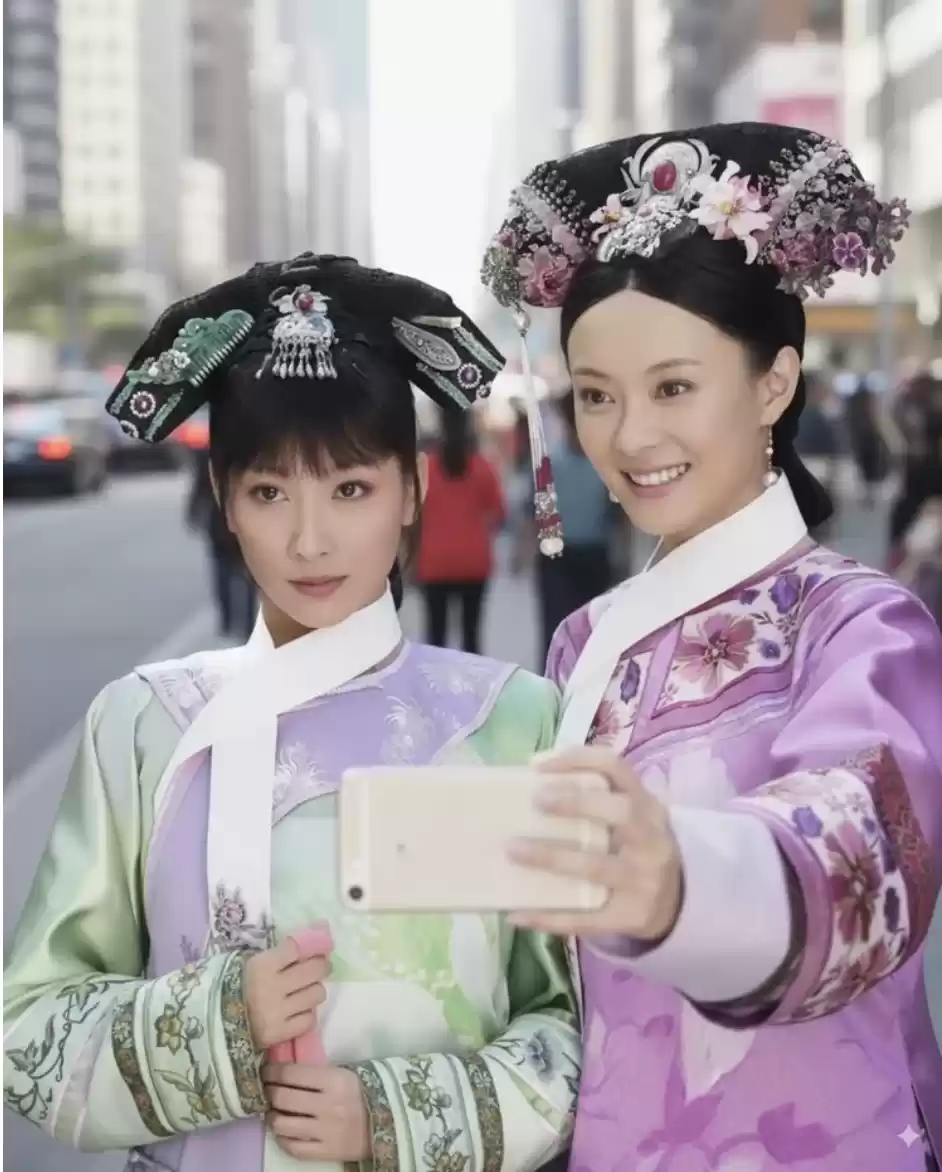 接下来,我们又尝试了多张图片融合,据官方介绍能够保持人物的一致性,目前最多可支持三张图片合成,我们尝试了一下让甄嬛和安陵容来到现代都市,并且要求保持复杂的中国传统首饰不变形。
