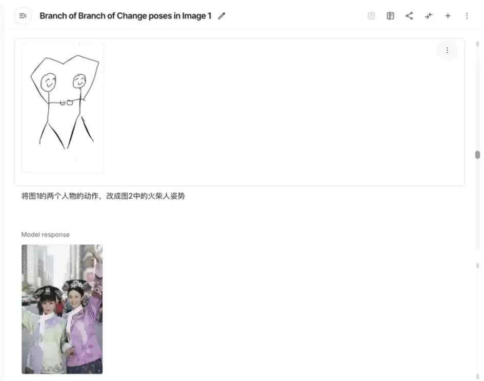 如果觉得这个姿势不够满意,甚至可以通过简笔画的方式,让AI直接理解图片示例,比如我们直接告诉AI,姿势照着图二修改。
