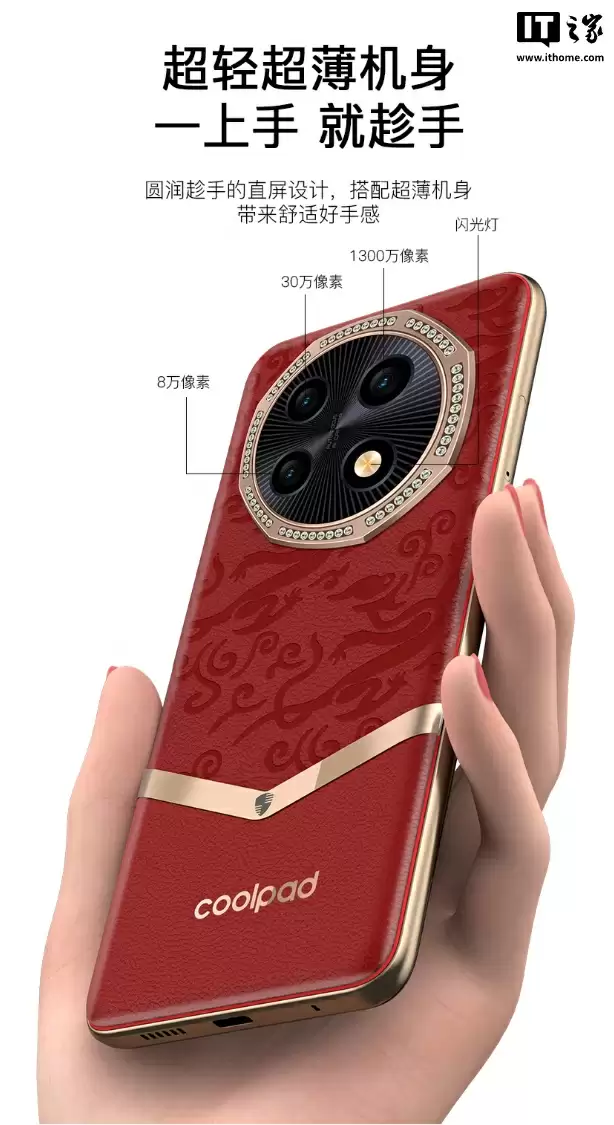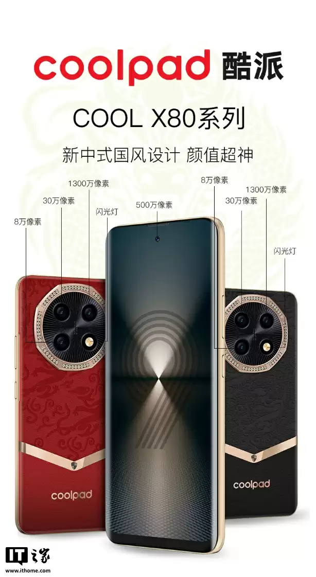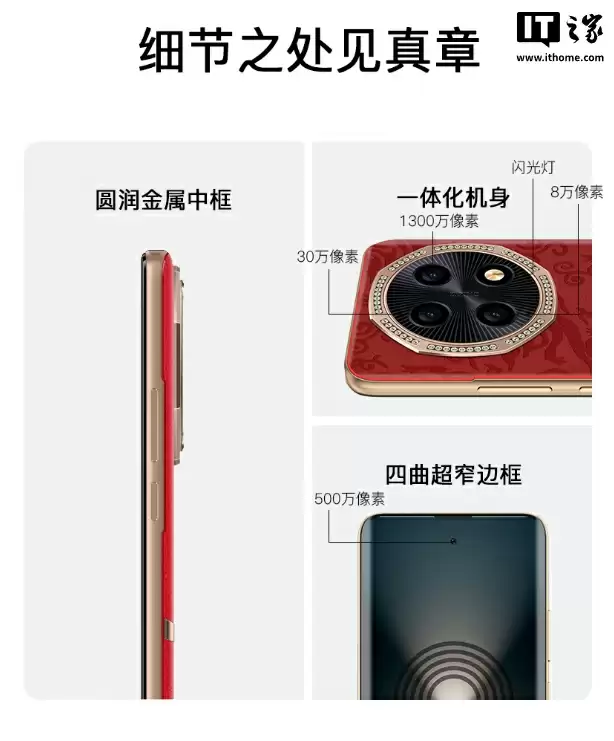 根据官方介绍,这款手机有红色、黑色两种配色,在外观方面采用“新中式一体化机身设计”,其后盖使用“龙纹皮革一体化压印技术”,摄像头模组上点缀有“国风元素”,后摄分别为 1300 万像素 + 30 万像素 + 8 万像素。