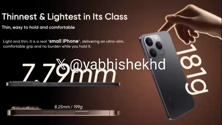 外观方面,根据曝光的宣传物料,realme 15T 手机主打“轻薄大电池”,采用 iPhone 16 Pro Max 风格,机身厚度仅为 7.79 毫米,重量 181 克。附上相关图片如下:
