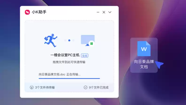 除核心性能与模式创新外,向日葵 16 还首发上线“小 K ”,主打高效文件传输与场景化服务。用户无需打开远程桌面或专用传输界面,只需将文件拖拽至“小 K ”悬浮窗,即可秒速发送至另一台设备,大幅简化文件交互流程,并且全程都在本地操作,无需三方传输软件上传下载。