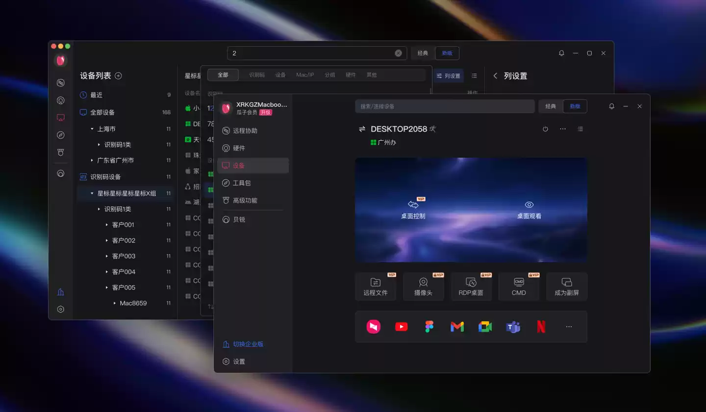 此外,向日葵 16 软件界面也进行了焕新升级,带来两种全新的设备管理模式,满足不同使用需求:常用设备较少时,可一键直达远控,快速使用远程摄像头、RDP 桌面、CMD 等功能,或是一键启动超级桌面,实现远程应用本机无缝融合运行;设备数量较多时,列表模式支持按识别码、设备名、MAC / IP 等条件筛选,还能自定义展示内容,实现高效查找和管理。
