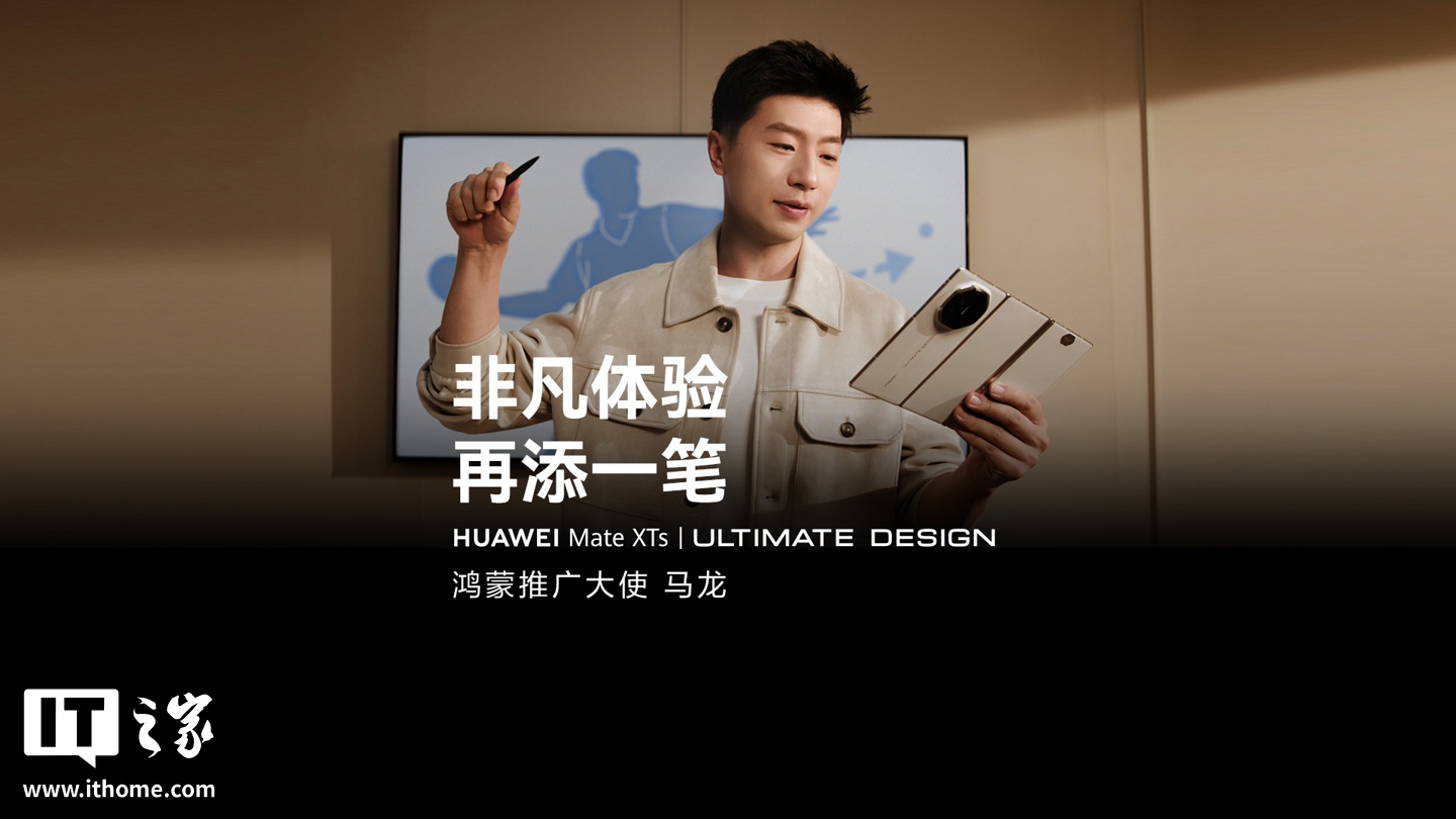 稍后,华为终端又发布了一部视频,这次则是乒乓球运动员马龙出任“鸿蒙推广大使”,带来了 Mate XTs 的白色版本。