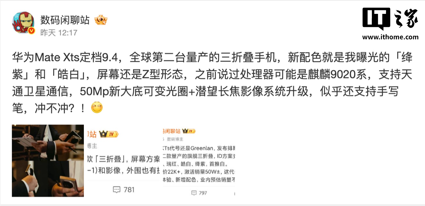 根据博主 @数码闲聊站 的爆料,华为 Mate XTs 将提供「绛紫」和「皓白」两种新配色,支持天通卫星通信,50Mp 新大底可变光圈 + 潜望长焦影像系统升级。