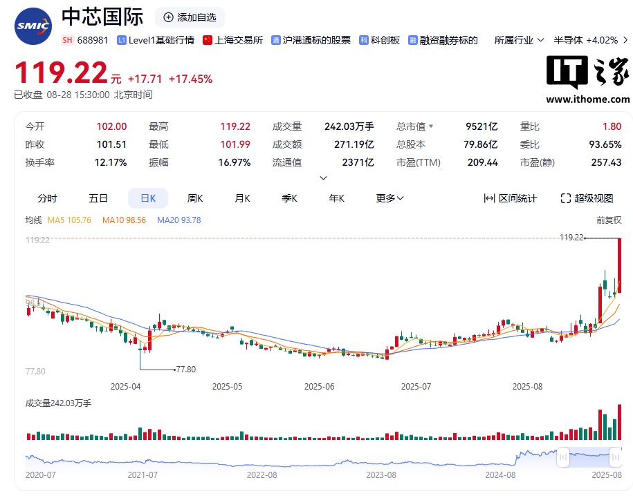 8 月 28 日消息,芯片股今日再次迎来爆发,除了寒武纪收盘价逼近 1600 元 A 股“称王”,中芯国际表现同样不俗。该公司收盘股价 119.22 元大涨 17.45% 创新高,总市值高达 9521 亿元。