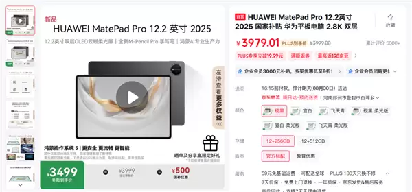 作为参考,同样搭载麒麟9020系列芯片的华为MatePad Pro 12.2英寸版本近期刚刚上市,官方定价3999元起。