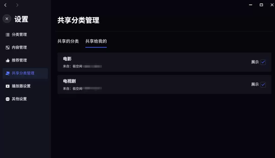 极影视现加入“共享给我”的分类,可以将指定影视库设为共享分类,使得在相同设备登录不同账号时也能看到,并支持设置指定账号可见,别人共享给我之后,我可以自己再管理这些分类,不喜欢别人共享给我的分类的时候,则可以不展示。