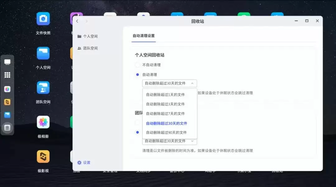 回收站现支持自定义设置定时自动清理功能,可根据需要进行设置,支持自动删除超过 1-90 天的文件,无需手动查找删除,随时为系统“瘦身”,释放更多可用空间。