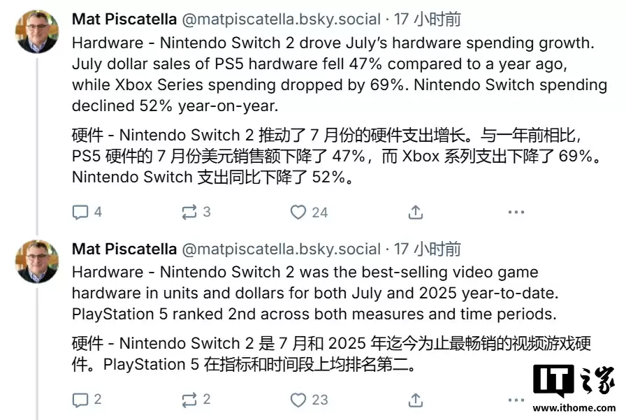 相比之下,其它主机在美国市场销量均显著下滑。PlayStation 5 7 月销量同比下跌 47%,初代 Switch 下跌 52%,Xbox Series 系列跌幅更高达 69%。尽管如此,Switch 2 稳居当月销量榜首,PS5 则排在第二位,并保持 2025 年全年至今的亚军位置。附上相关截图如下: