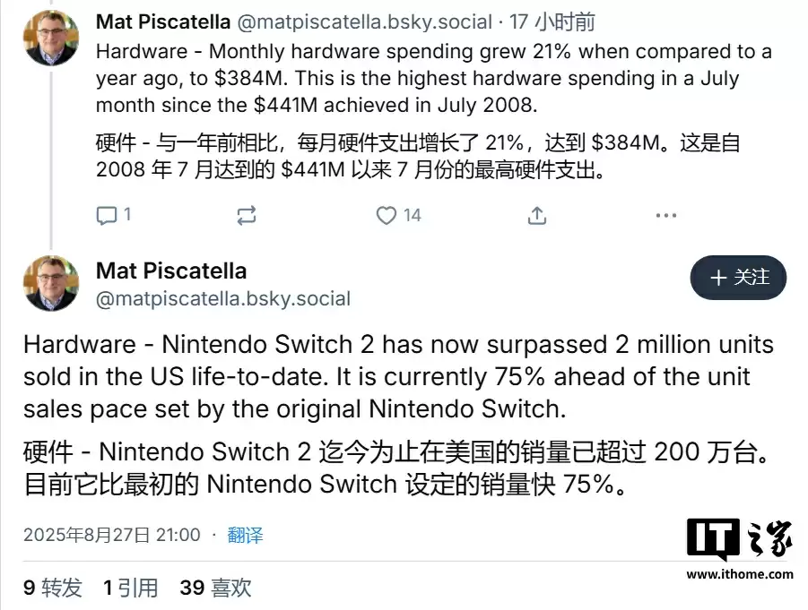 Switch 2 成美国7月硬件销量冠军,同期销量超初代75%