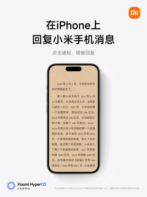 小米澎湃OS 3跨生态互联升级:iPhone用户可直接回复小米手机消息