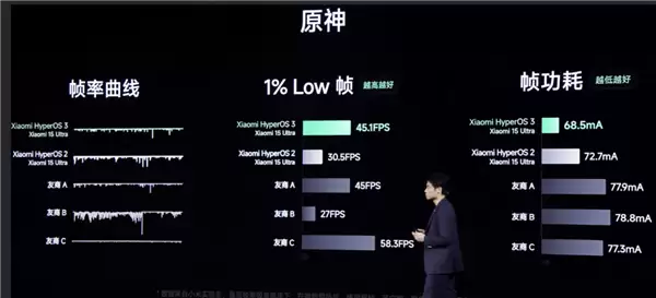 在1% Low帧场景,搭载澎湃OS 3的小米15 Ultra做到了45.1FPS,澎湃OS 2的表现是30.5FPS。