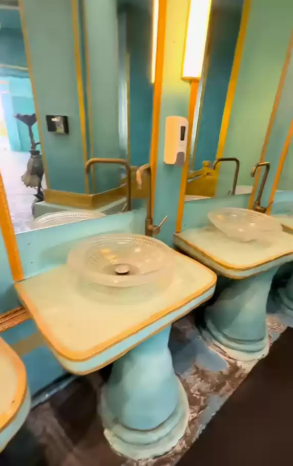 内部也采用了和“玉虚宫”类似的配色,清凉整洁,并设有类似铜铸的“仙鹤”装饰件,古香古色,甚至连洗手池都用了“琉璃色”,营造奢华感。