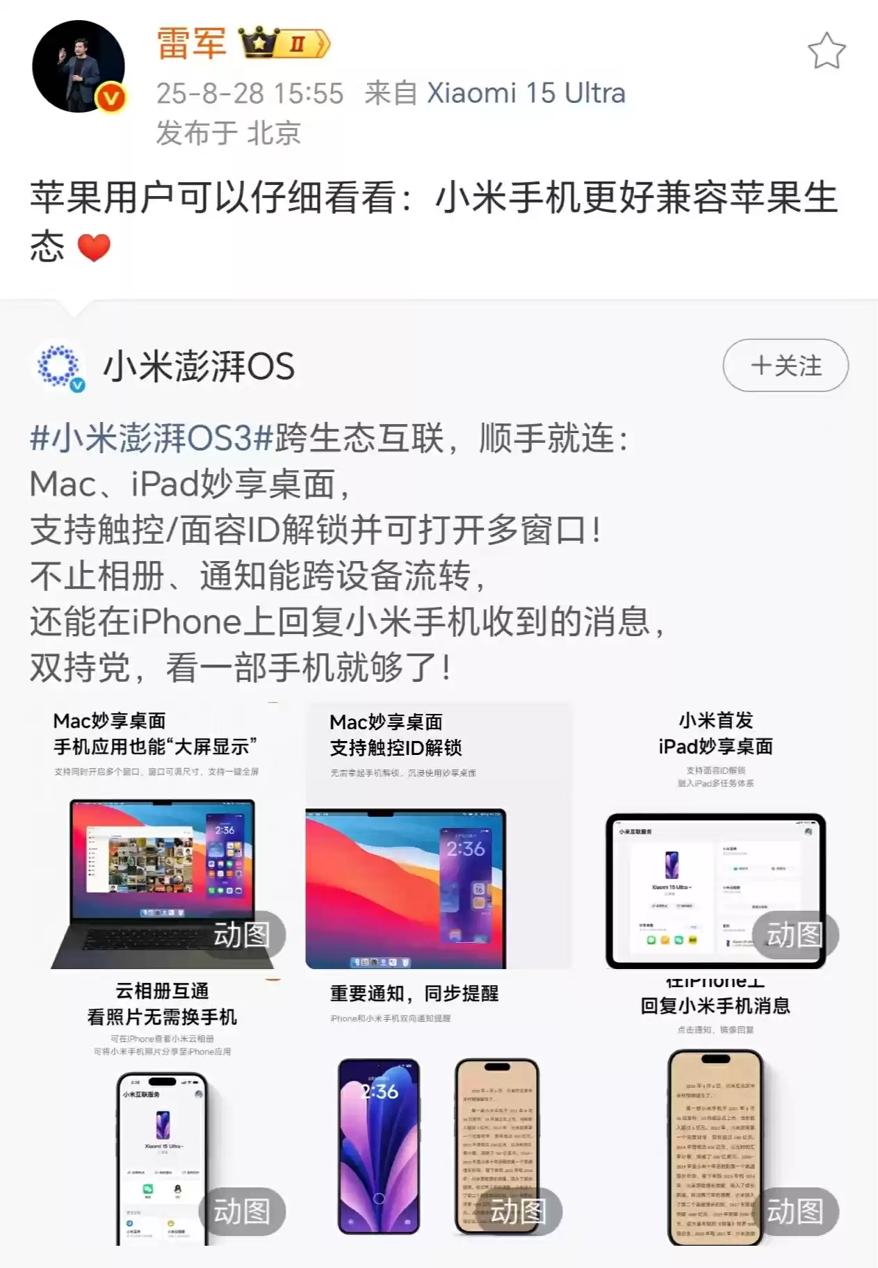 发布会当天,小米集团创始人雷军通过社交平台发文表示:"诚邀苹果用户体验:小米手机现在对苹果生态的兼容性更胜从前。"