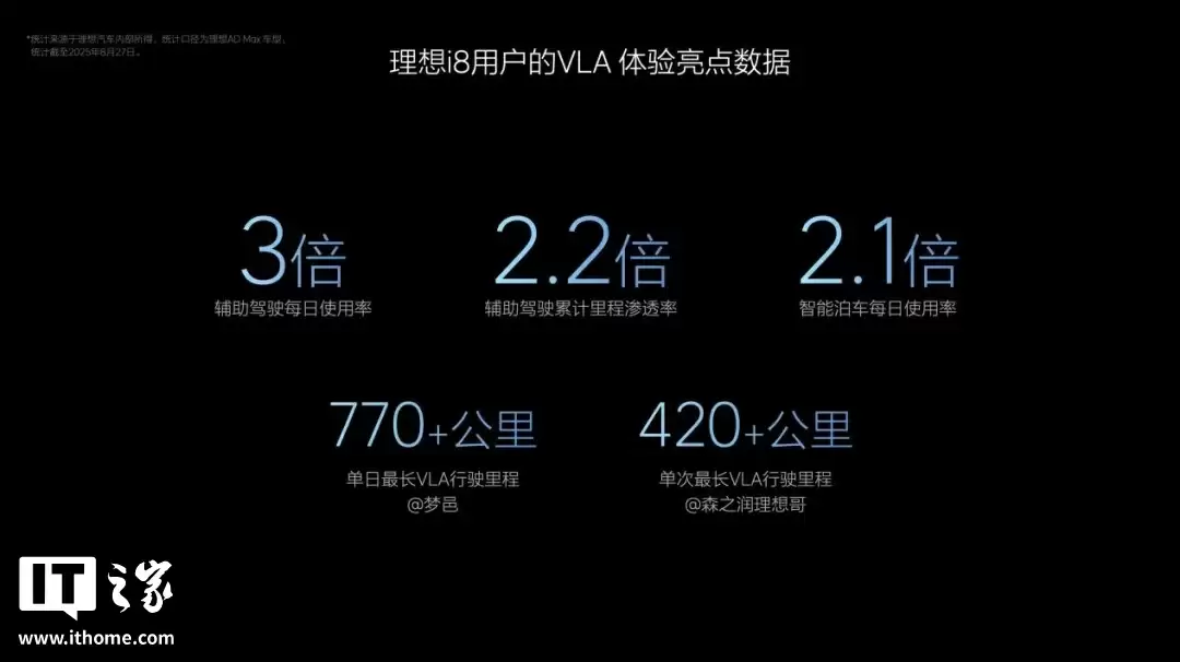 理想汽车称,自 8 月 20 日理想 i8 与 VLA 司机大模型同步交付以来,首批理想 i8 用户中的单日最长 VLA 行驶里程超 770 公里,单次最长 VLA 行驶里程超 420 公里。VLA 随理想 i8 上市交付后,辅助驾驶每日使用率提升 3 倍,累计里程渗透率提升 2.2 倍,泊车每日使用率提升 2.1 倍。