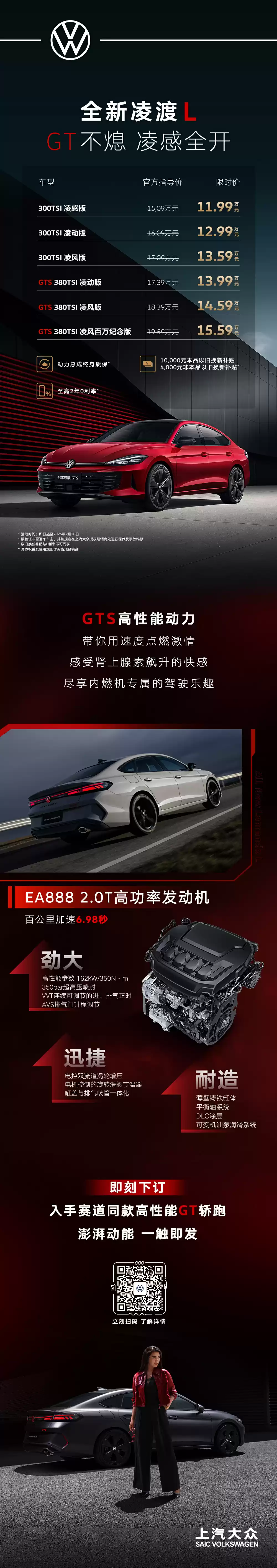 8 月 29 日消息,在今日的成都车展上,上汽大众宣布新款凌渡 L 正式上市,1.5T 限时价 11.99 万元起,采用 EA888 2.0T 发动机的 GTS 2.0T 限时价 13.99 万元起。