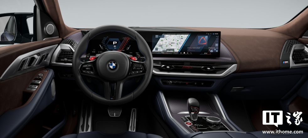 进入车内,2025 款宝马 XM Label 车型采用全新暗蓝色和黑色复古设计座椅,搭配真皮自然纹路。中控台采用了棕色材质包覆,方向盘等细节处加入了红色缝线,营造出极具运动感和时尚感的内饰氛围。一体式悬浮曲面屏集成了 12.3 英寸液晶仪表和 14.9 英寸中控显示屏,搭载了宝马最新的第 8.5 代操作系统,并配备了 M 专属设计界面。此外,新车还特别在后排配备了透光度仅为 5% 的隐私玻璃,为后排乘客提供了更好的私密性保护。