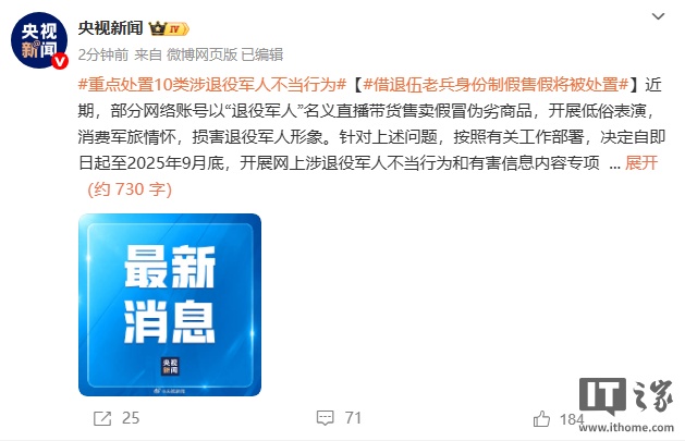 8 月 29 日消息,近期,部分网络账号以“退役军人”名义直播带货售卖假冒伪劣商品,开展低俗表演,消费军旅情怀,损害退役军人形象。