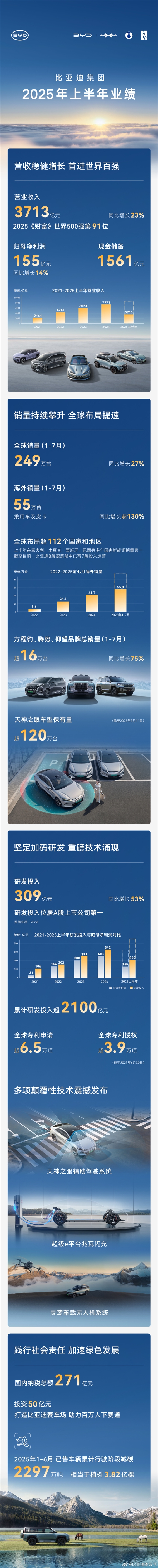 8月29日最新财报显示,比亚迪在2025年上半年交出了一份亮眼的成绩单。公司营收突破3713亿元大关,同比增幅达23%;净利润实现155亿元,增长14%;研发投入更是高达309亿元,同比增长超五成。值得注意的是,公司现金流充沛,储备资金达到1561亿元。