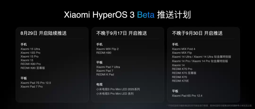 本次小米澎湃 OS 3 Beta 版计划共覆盖 25 款机型,涵盖手机、平板、电视三个品类,按三个批次陆续开启招募。首批机型用户通过招募后,可从 8 月 29 日起收到 Beta 版推送;我们还计划不晚于 9 月 17 日、9 月 30 日开启第二批和第三批小米澎湃 OS 3 Beta 版用户推送,覆盖更多机型。