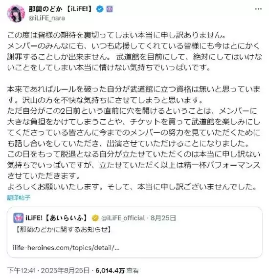 那兰Nodoka在个人声明中坦言:“我做出了绝对不该做的事情,内心充满愧疚与自责。原本认为自己违背了规则,已经失去站在舞台上的资格,但考虑到演出仅剩两天时间,临时缺席会给其他成员带来巨大压力,因此决定继续登台,全力以赴完成最后一场演出。在此向大家致以最诚挚的歉意。”