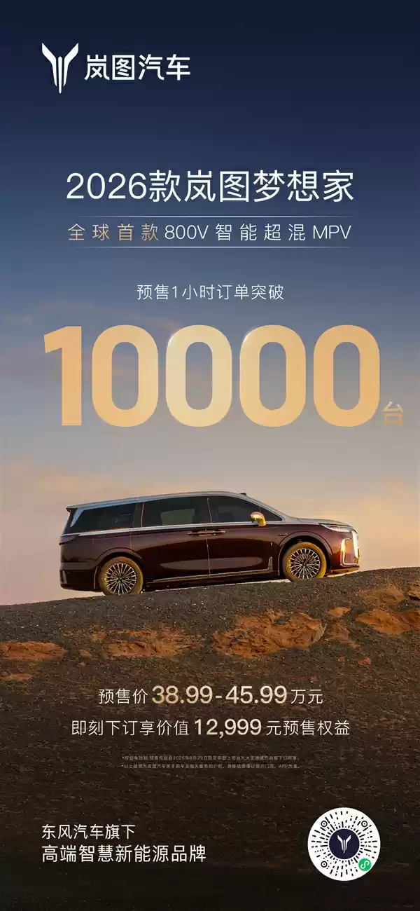 2026款岚图梦想家:全球首款800V超混MPV,预售1小时订单破万