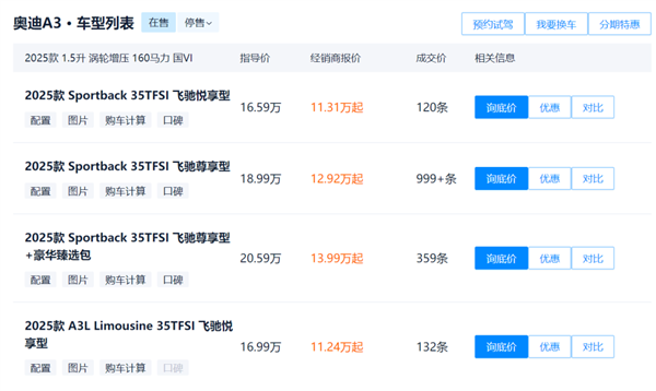 《次世代车研所》栏目发现,在奥迪所有车型中,2025款一汽奥迪A3的裸车报价已跌至11.24万元起,相当于打了六六折。