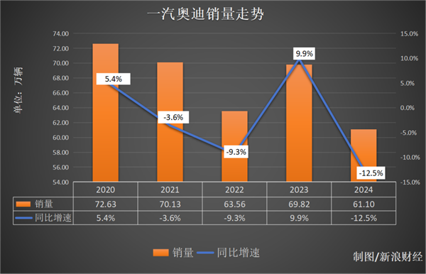 虽然一汽奥迪在2023年迎来了销量反弹,同比增长9.9%至69.82万辆;但2024年,其销量仅为61.1万辆,同比暴跌12.5%,销量创下多年新低,跌幅则创下多年新高。