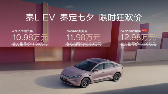 8月29日成都车展现场,比亚迪秦L EV云辇版正式亮相并开启预售。值得关注的是,恰逢七夕佳节,官方同步推出限时特惠活动,全系车型狂欢价10.98万至12.98万元。