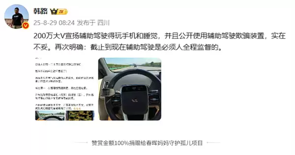 博主韩路怒斥:大V鼓吹辅助驾驶可玩手机睡觉,竟用欺骗装置误导用户