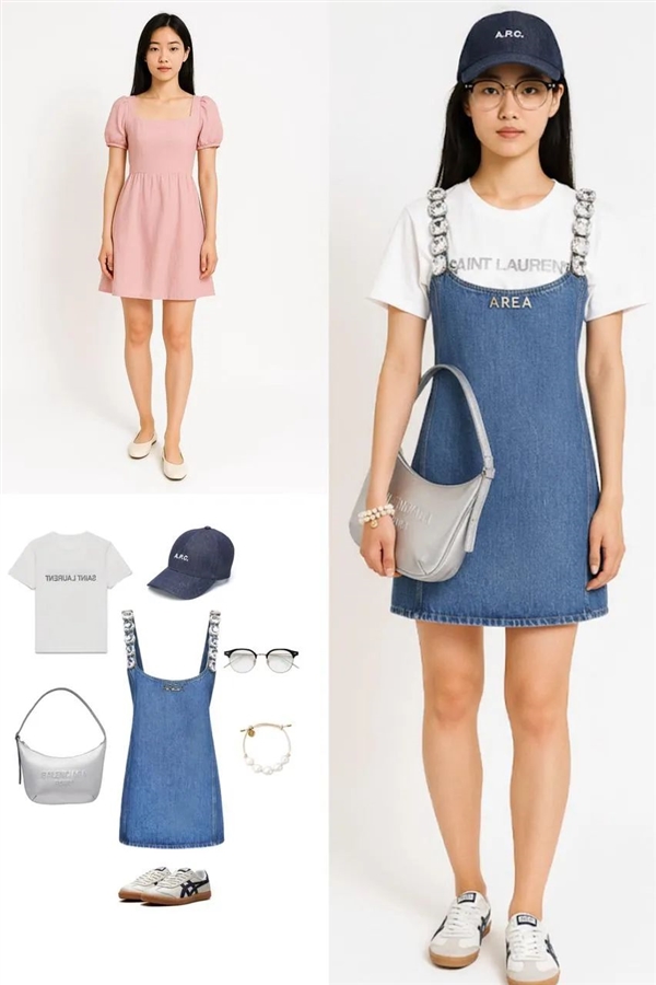 比如这种一键试穿,需要把平铺的各种服饰 P 到人的身上,而 nano-banana 对细节的把控非常到位。