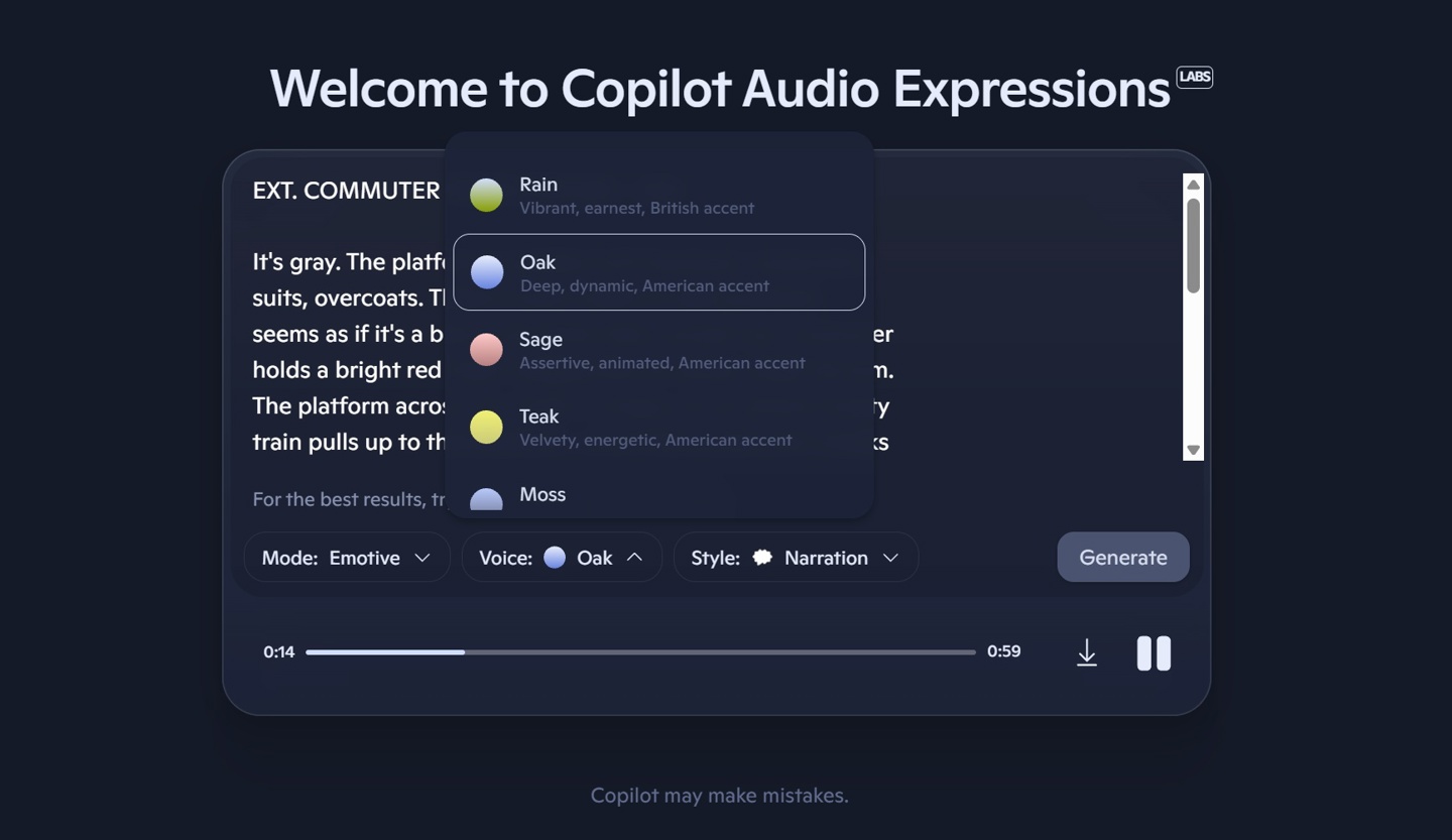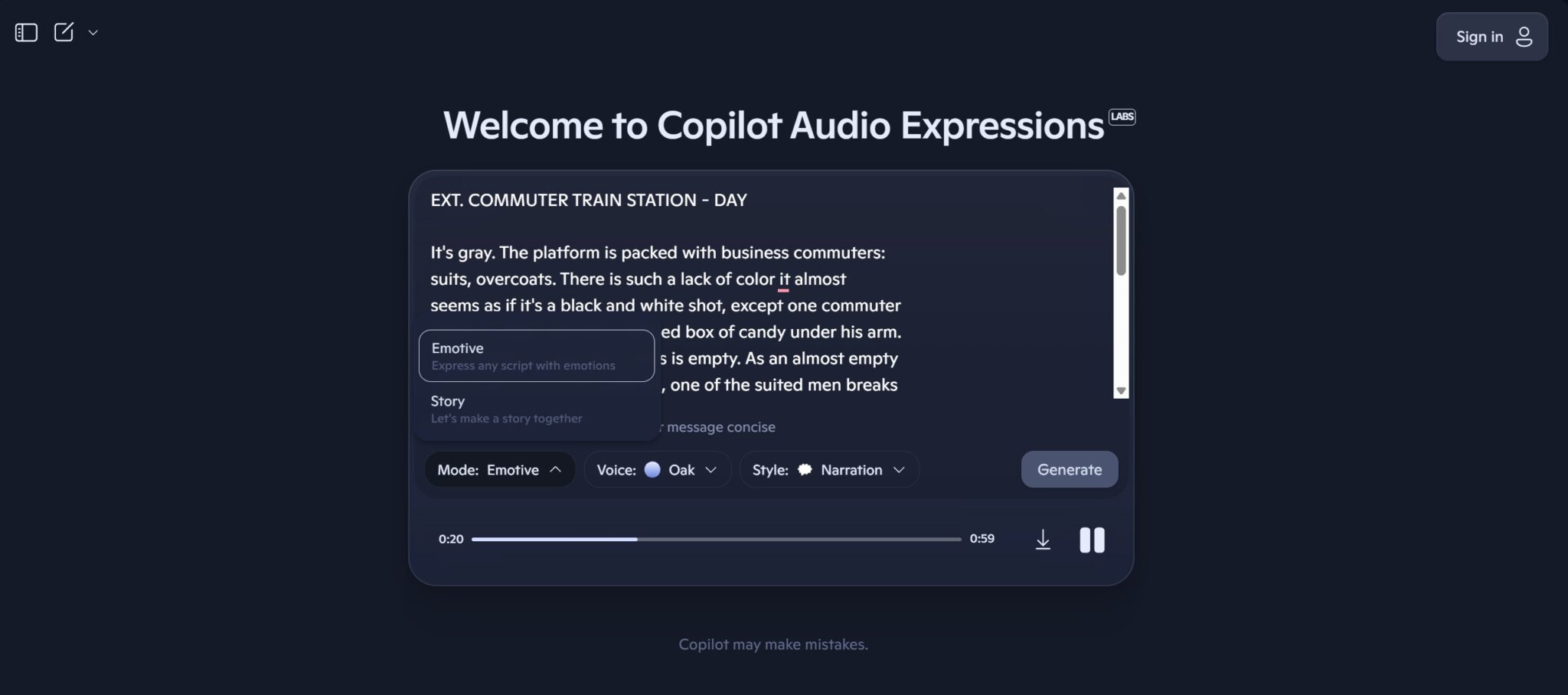 8 月 30 日消息,科技媒体 Windows Latest 昨日(8 月 29 日)发布博文,报道称微软在 Copilot Labs 推出全新 AI 语音生成工具 Copilot Audio Expressions,可通过 Emotive 和 Story 两种模式生成更具情感的英文语音。