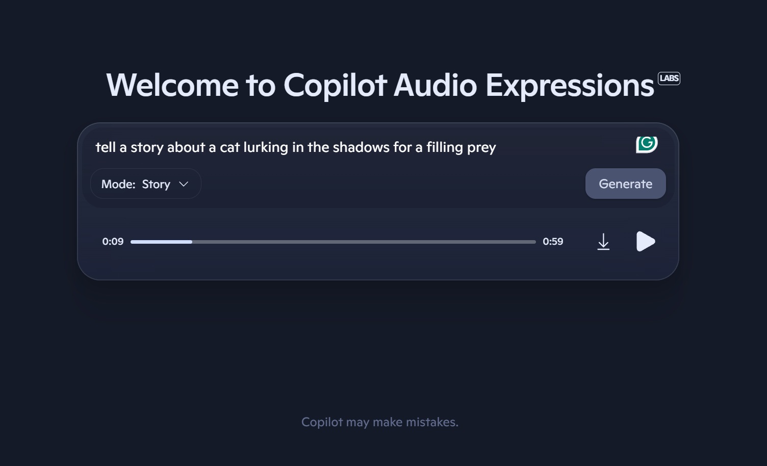 注:Copilot Audio Expressions 是一款 AI 语音生成工具,功能是让输出的音频更接近真人,并可根据需求加入创意润色。用户无需注册即可直接体验,并可下载 MP3 格式音频,方便在任何设备播放。