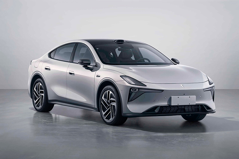 这款新车定位中型轿车,长宽高分别为 4830x1905x1480mm,轴距 2900mm,提供纯电、增程两种动力,外观件上可选电动尾翼及黄绿色的卡钳装饰罩。上述实车图显示,新车具备低矮的轿跑姿态,线条舒展流畅。
