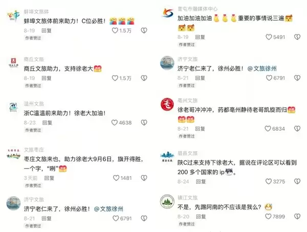 抖音评论区的留言一眼望不到头——几十家文旅官号齐刷刷站出来为徐州应援: