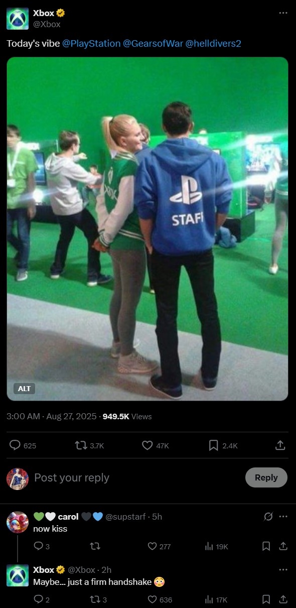 Xbox官方账号大方承认了这种暧昧,有玩家建议俩人亲一口,微软表示还是先从拉手开始: