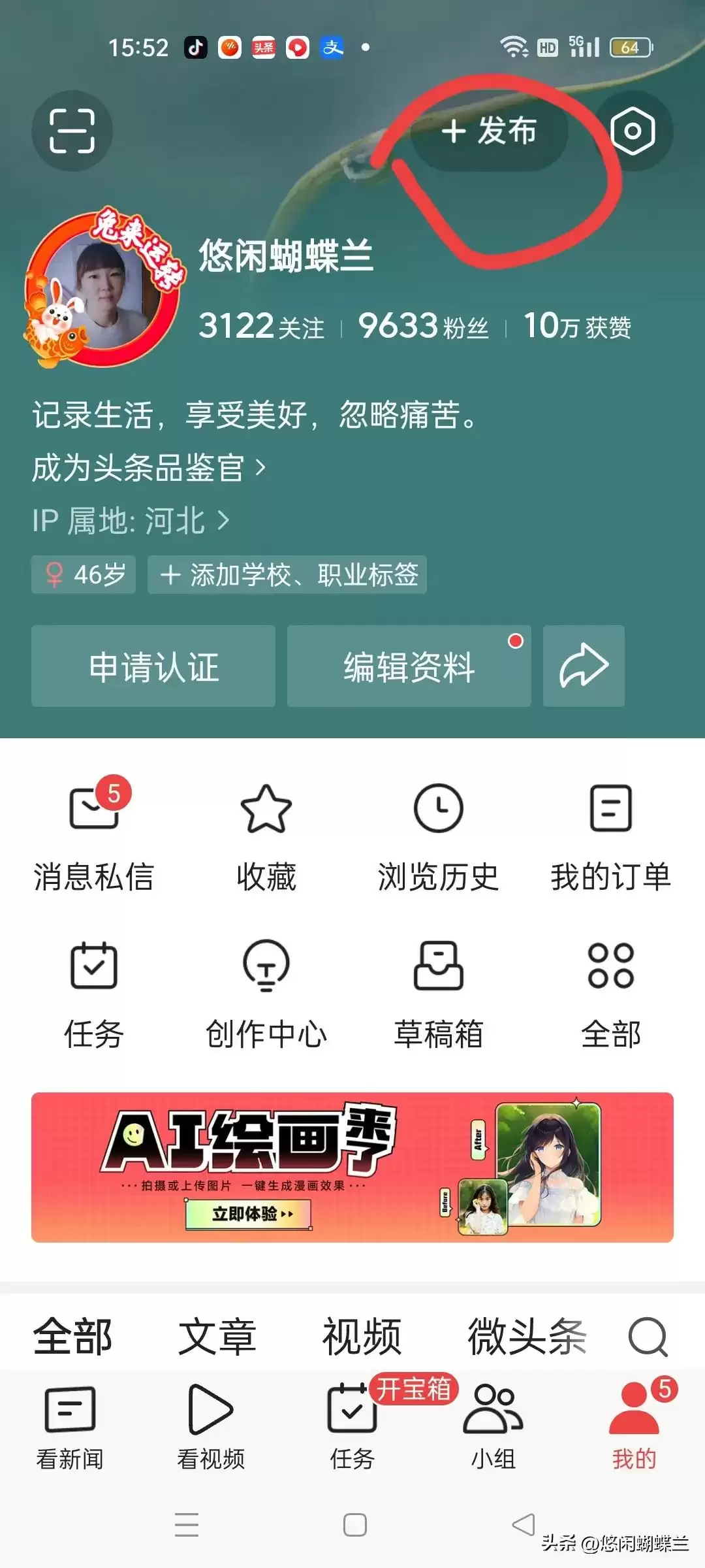 第1步,打来头条,点开我的,点右上角发布,点文章,就可以开始写文章了。