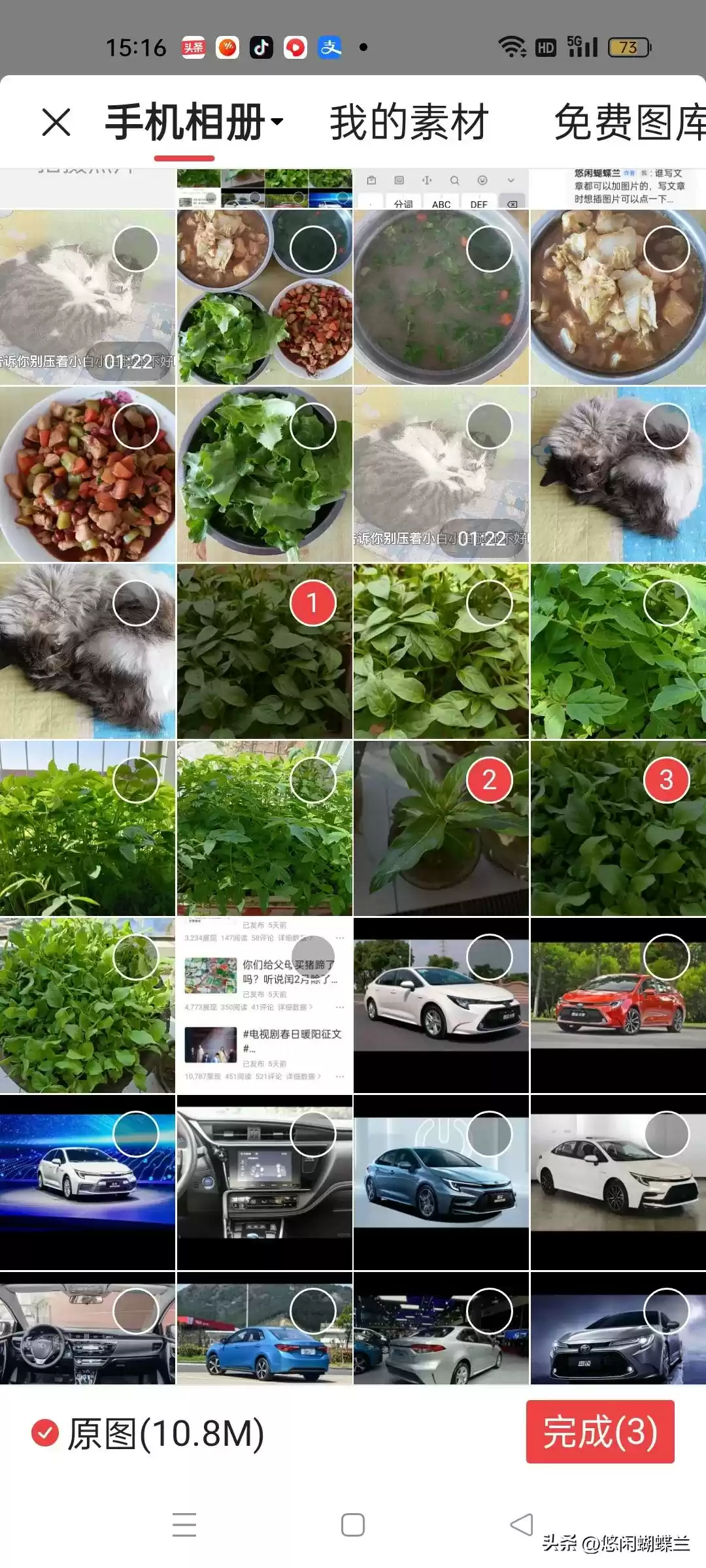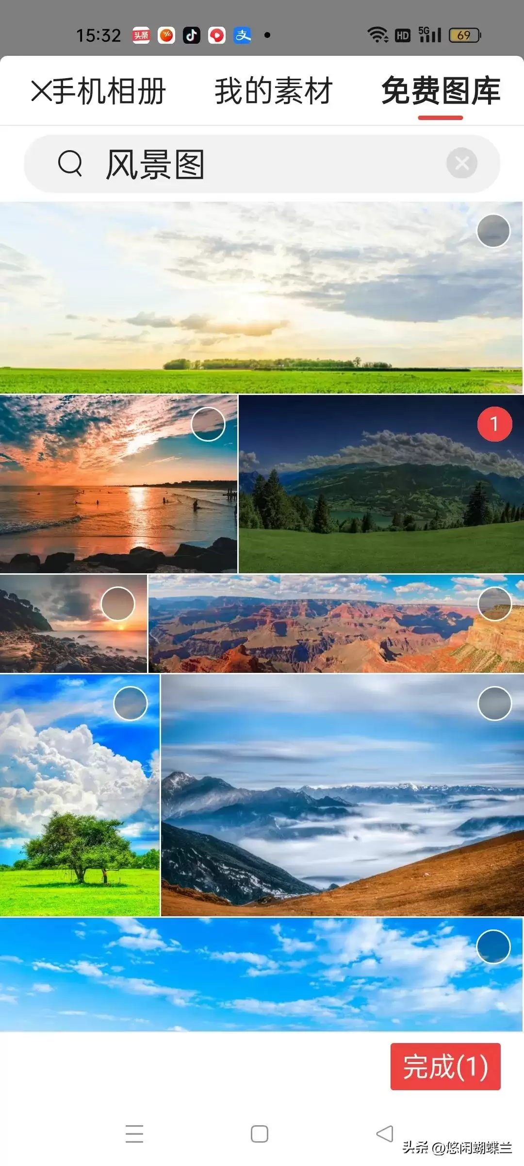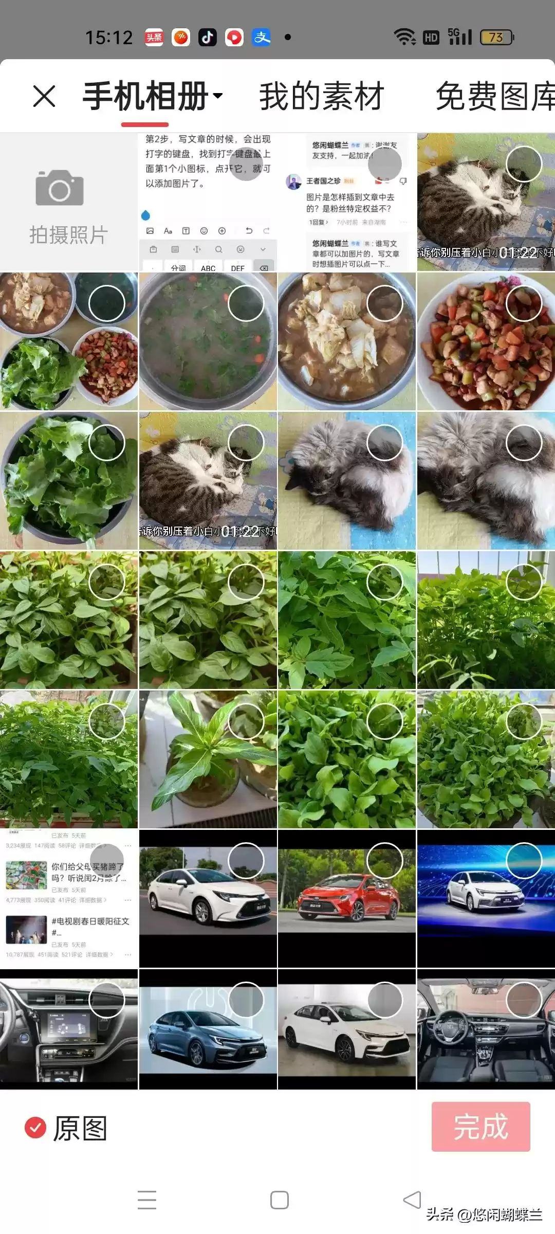 然后,你选择自己喜欢的图片,点一下图片右上角的圆圈,然后再点右下角的完成,图片就添加到你的文章里了。