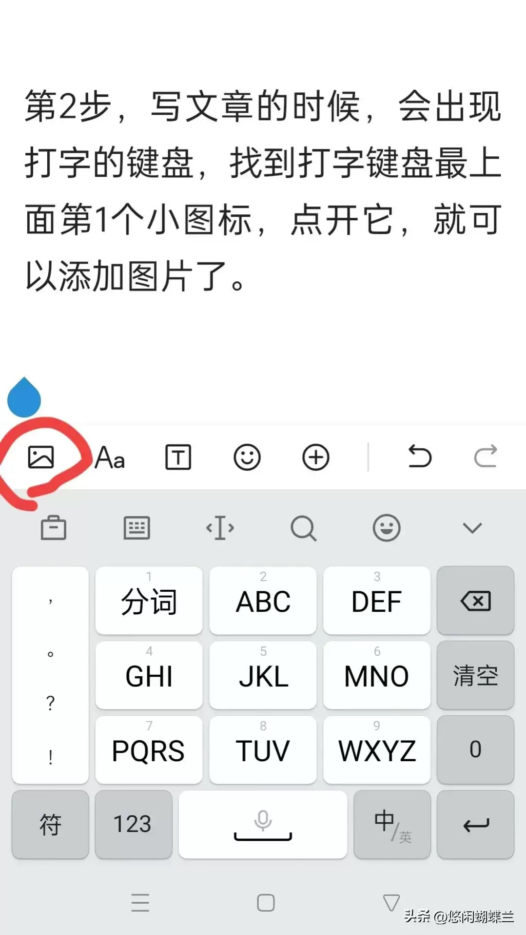 第2步,写文章的时候,会出现打字的键盘,找到打字键盘最上面第1个小图标,点开它,就可以添加图片了。
