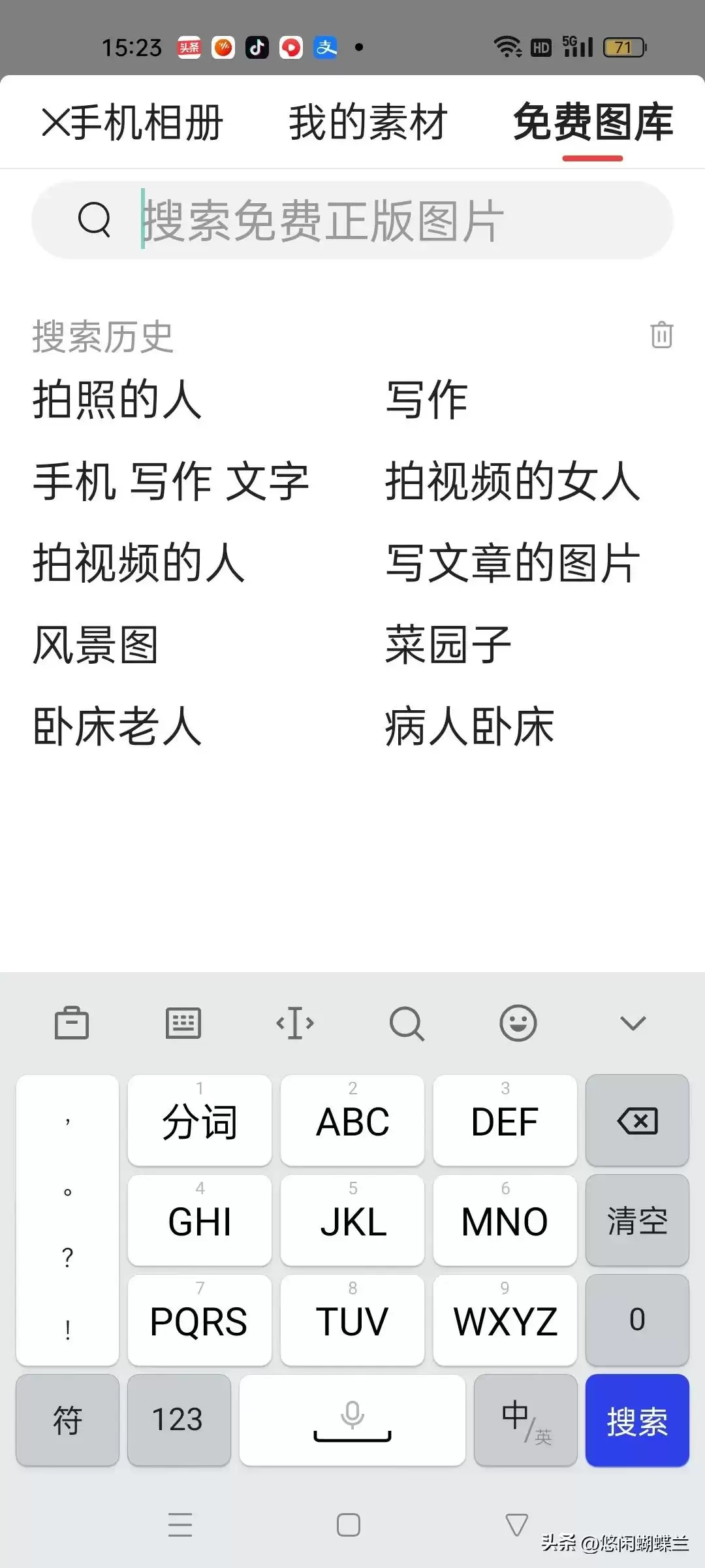 如果你的手机相册里没有你要需要的照片。就可以在免费图库里选择适合自己文章的照片。