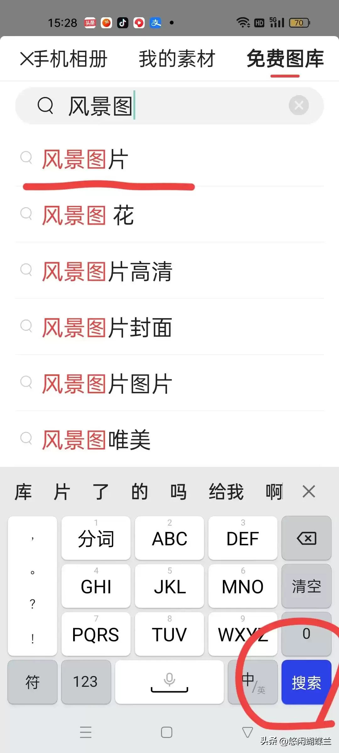 比如你想找风景图,就在放大镜后面打上风景图3个字,下面就会出现很多关键字,你可以点一下关键字,也可以点一下右下角搜索两个字,就会出现好多风景照片了。