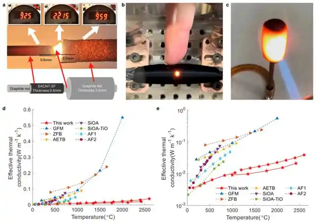对比来看,常用的高温隔热材料石墨毡在相同高温下的热导率高达 1.6 瓦 /(米・开尔文),由此可见新型碳纳米管材料的隔热性能显著更优。