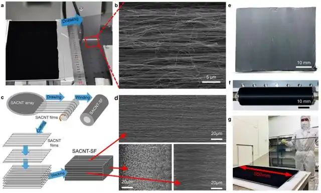 值得一提的是,这种碳纳米管材料还具有良好的柔韧性,可贴合不规则形状物体表面。目前团队已实现宽度达 550 毫米的薄膜规模化生产,未来有望进一步制备出数百米长的卷材。