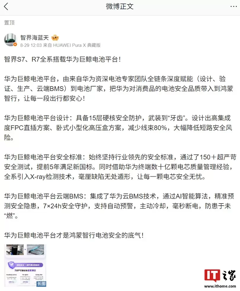 8 月 31 日消息,据智界产品总监 @智界海蓝天 分享,鸿蒙智行智界 S7、R7 汽车全系搭载华为巨鲸电池平台,该平台由来自华为资深电池专家团队全链条深度赋能(设计、验证、生产、云端 BMS)到电池厂家。