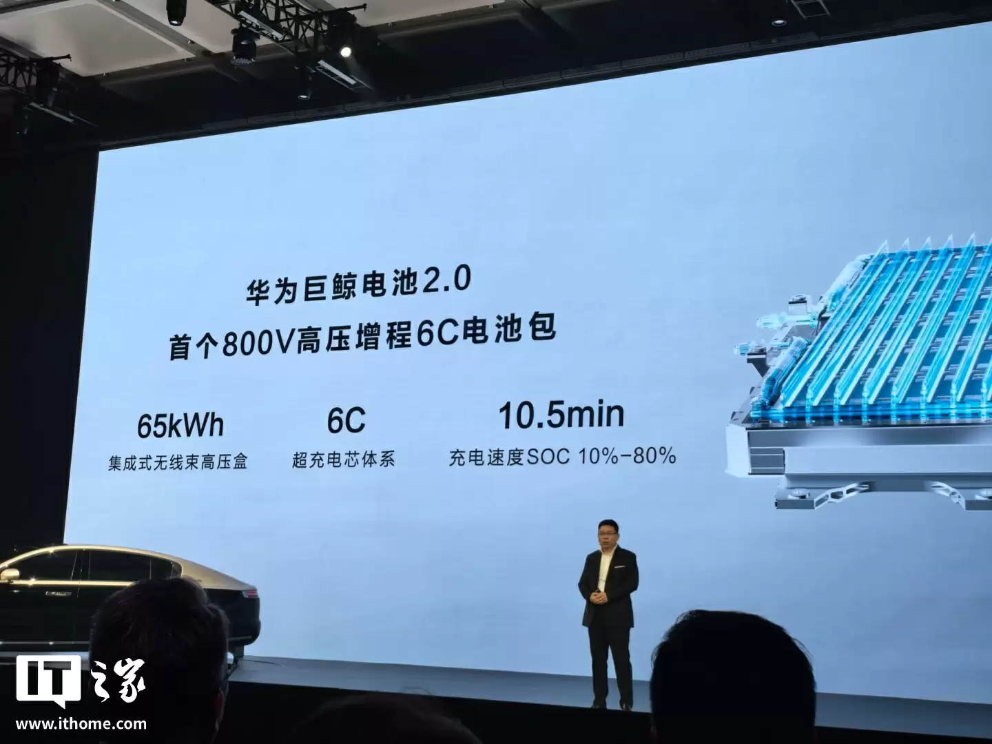 据此前报道,2023 年 11 月 28 日,华为常务董事、智能汽车解决方案 BU 董事长余承东在智界 S7 发布会上表示,该车搭载全新华为巨鲸 800V 高压电池平台,可实现充电 5 分钟续航 215km、双 800 纯电里程。今年 2 月,余承东宣布尊界 S800 首发行业首个 800V 高压增程 6C 电池包 —— 华为巨鲸电池 2.0,其采用 6C 超充电芯体系,SOC 10% 充至 80% 只需 10.5 分钟。