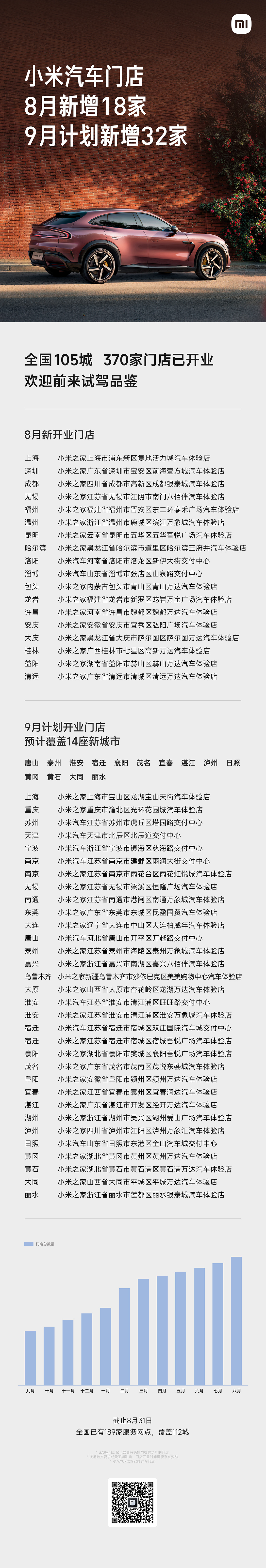 小米汽车8月新增18家门店,全国服务网点达189家,9月再开32店